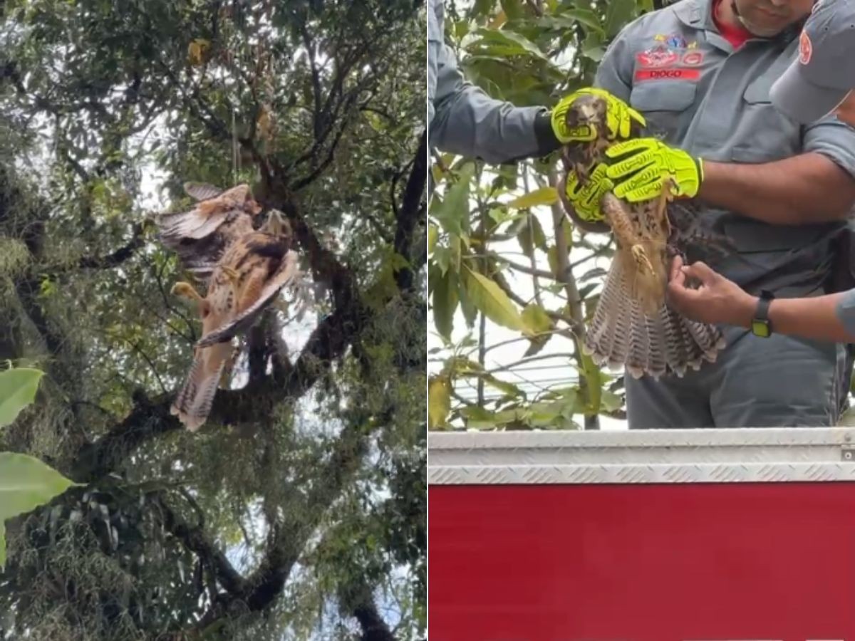 Gavião asa-de-telha é salvo após ficar enroscado em linha de pipa presa em árvore; VÍDEO